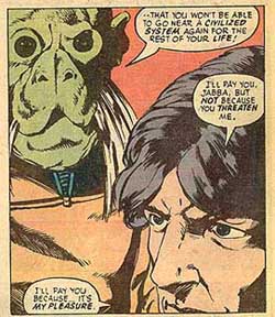 Last topic: favorite EU moments? I loved loved loved seeing Jabba’s “substitute” Mosep Binneed—for those who don’t know, Mosep dates back to the very first issues of the Marvel comics Star Wars adaptation (and technically even appears in ANH), at which point he was called “Jabba the Hut”, because no one in those days knew what Jabba was going to end up looking like. His “true” identity as Mosep didn’t come about until the late nineties, but even since then people haven’t exactly been falling all over themselves to use the character.