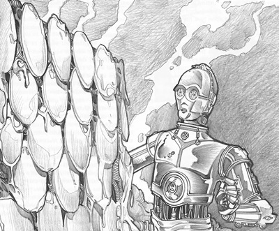 More recently, efforts to incorporate science fiction elements into the setting have largely been led by Troy Denning, who made more of Zahn’s fairly obscure use of teleportation and introduced a time travel Force power on top of it. Denning, despite a background as primarily a fantasy author, also has made heavy use of nanotechnology and highly technology-centric solutions to problems (such as his ubiquitous YVH droids). A sequence in his Dark Nest books in which the Millennium Falcon encounters difficulty while traveling in hyperspace and consequently must fly through it backwards, with reality-distorting effects, stands out as a segment of story based around science fiction storytelling — a concern with the causes and effects of technology, a scientific problem and scientific solution. We have also seen time travel utilized in Crosscurrent, without any of the ambiguity of Denning’s Force-powered flow-walking, through scientific means. The work of Michael Reaves in the prequel era has also indicated a fondness for science-fiction concepts like multiple dimensions, though more as flavor to the universe than the focus of storytelling.
